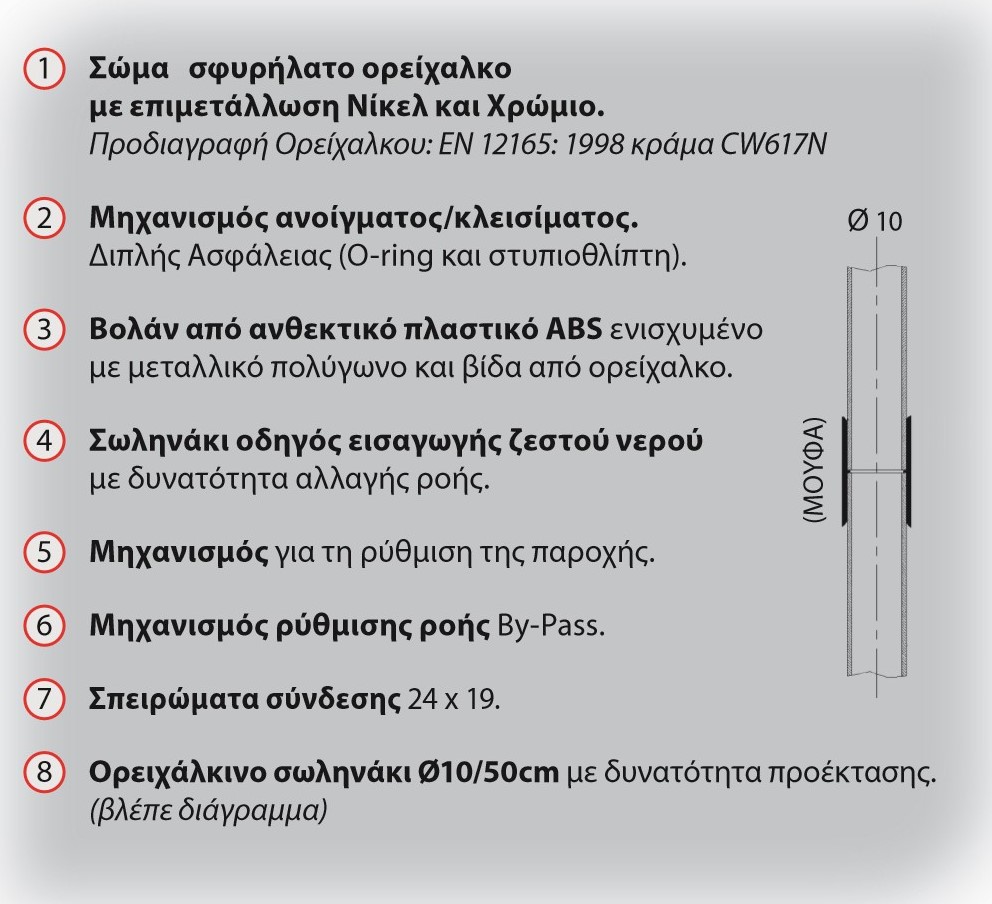 - Σώμα σφυρήλατο ορείχαλκο με επιμετάλλωση Νίκελ και Χρώμιο. Προδιαγραφή Ορείχαλκου: ΕΝ 12165:1998 κράμα CW617N