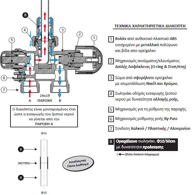 - Σωληνάκι οδηγός εισαγωγής ζεστού νερού με δυνατότητα αλλαγής ροής