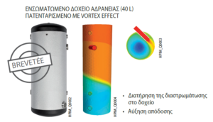 Ένα από τα σημαντικότερα ζητήματα που έχει να αντιμετωπίσει μια αντλία θερμότητας είναι οι φάσεις απόψυξης (defrost) κατά την διάρκεια των πολύ κρύων ημερών του χειμώνα. Οι συνεχείς εκκινήσεις θα πρέπει να αποφεύγονται με στόχο την μεγιστοποίηση του χρόνου ζωής της αντλία θερμότητας. Η De Dietrich διαθέτοντας κορυφαίας ποιότητας καινοτόμα προϊόντα έχει μεριμνήσει για αυτό ενσωματώνοντας ένα δοχείο αδρανείας 40lt, τεχνολογίας Vortex, που επιτρέπει την ομαλότερη, αποδοτικότερη αλλά και οικονομικότερη λειτουργία της αντλίας θερμότητας.
